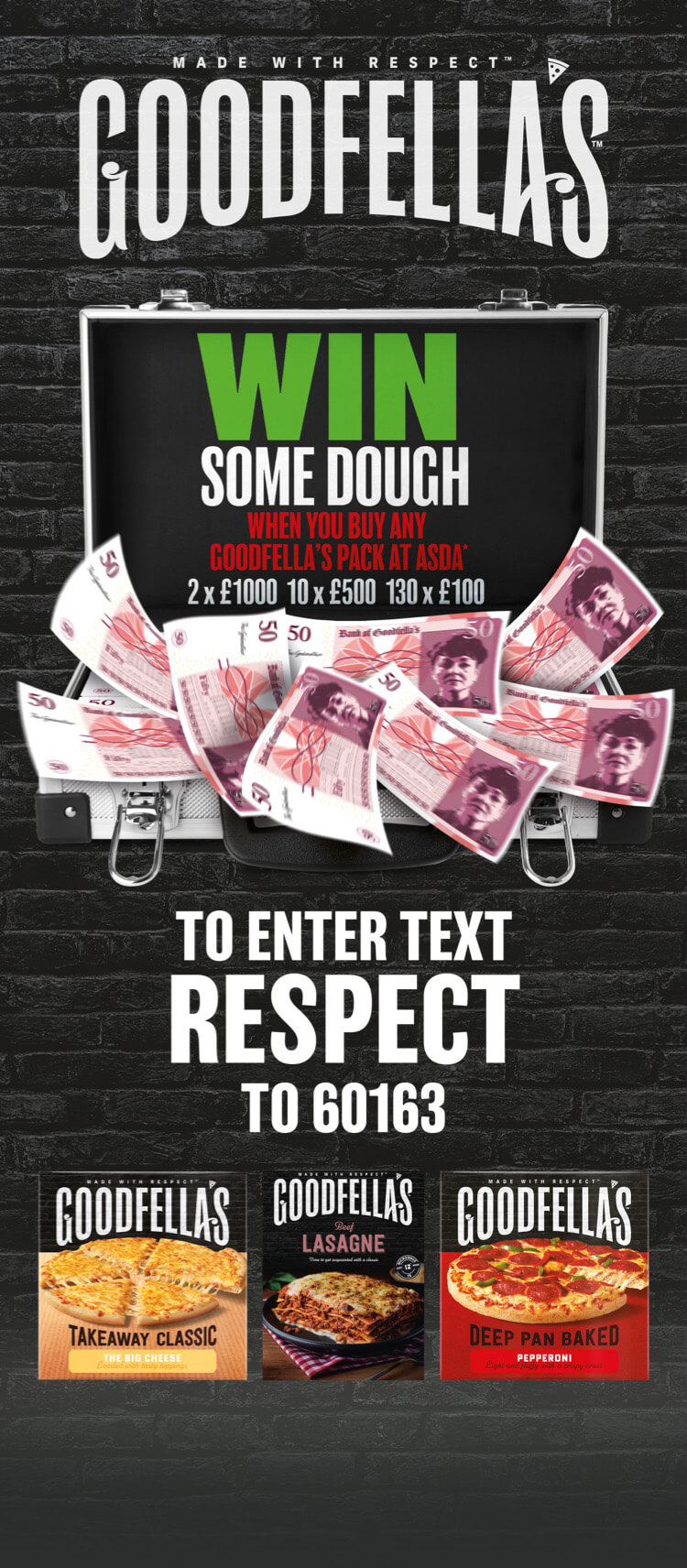 - Purchase is necessary. Receipt confirming a purchase of any Goodfella’s product from an Asda store or via Asda.com within the Promotional Period should be retained, as proof of purchase will be required to claim a prize.